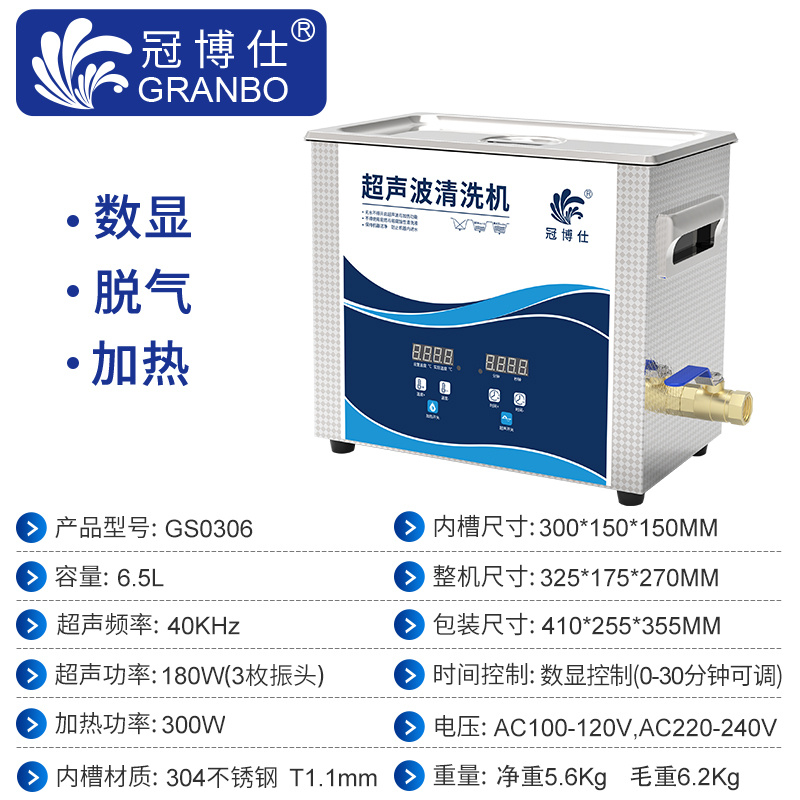 冠博仕GS0306超聲波清洗機|6.5L/180W|數顯定時調溫脫氣