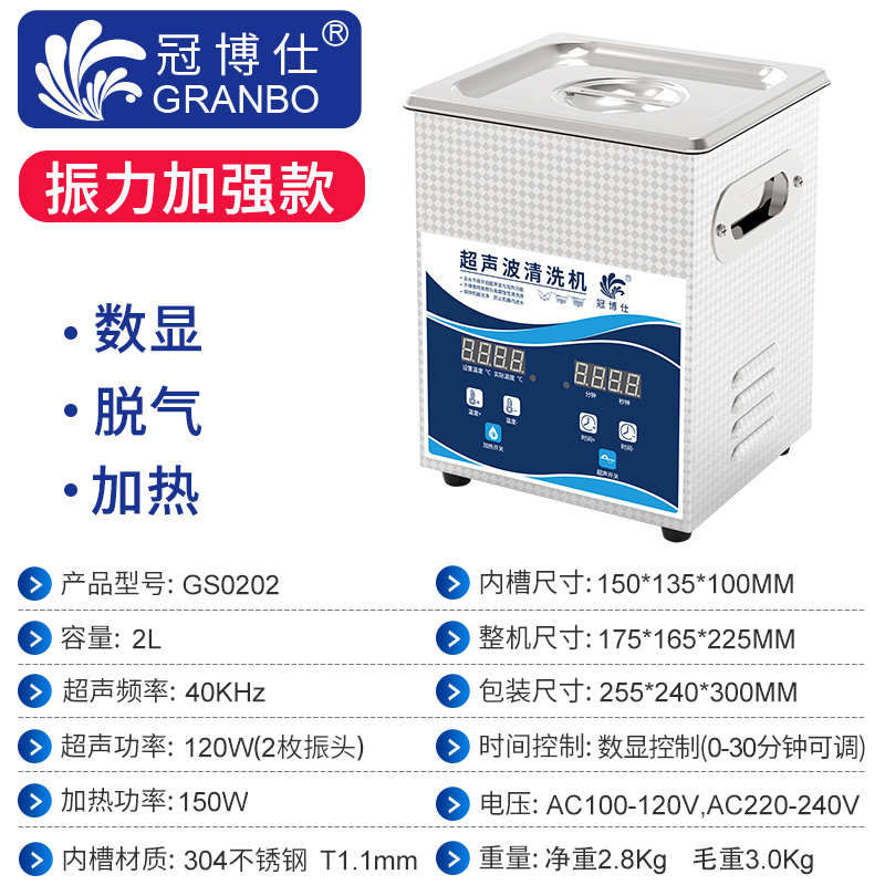 冠博仕GS0202超聲波清洗機|2L/120W|數顯定時調溫脫氣