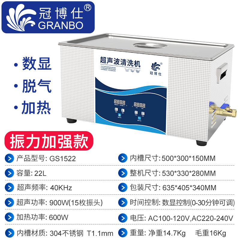 冠博仕GS1522超聲波清洗機|22L/900W|數顯定時調溫脫氣