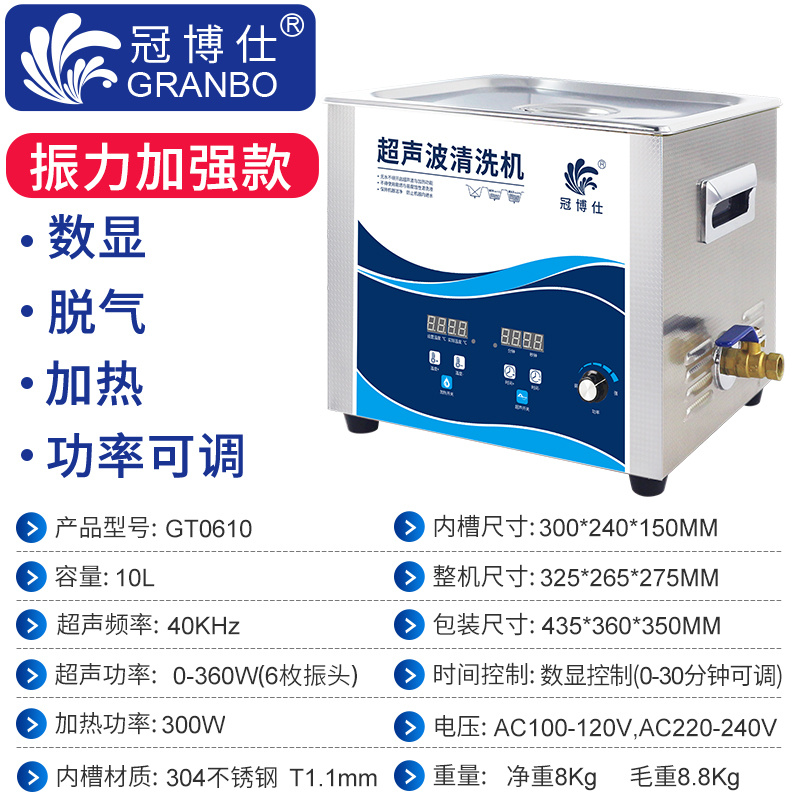 冠博仕GT0610超聲波清洗機|10L/360W|功率可調數碼定時帶加熱脫氣