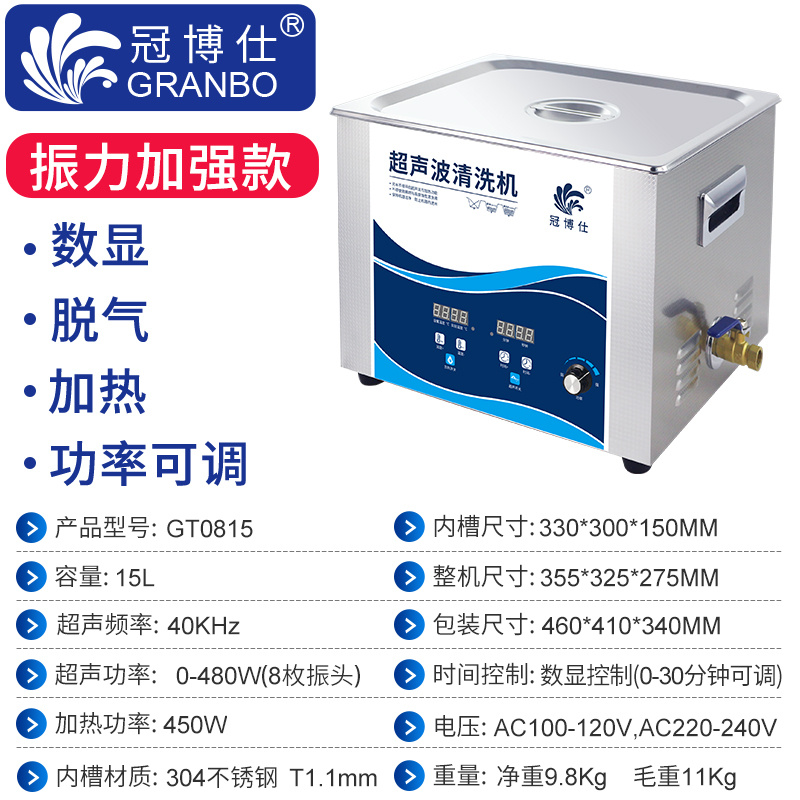 冠博仕GT0815超聲波清洗機|15L/480W|功率可調數碼定時帶加熱脫氣
